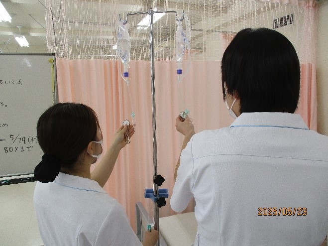 この日は、高看での白衣に初めて袖を通し、輸液の滴下調整やシリンジポンプ・輸液ポンプの取り扱いについて演習を行っていました。